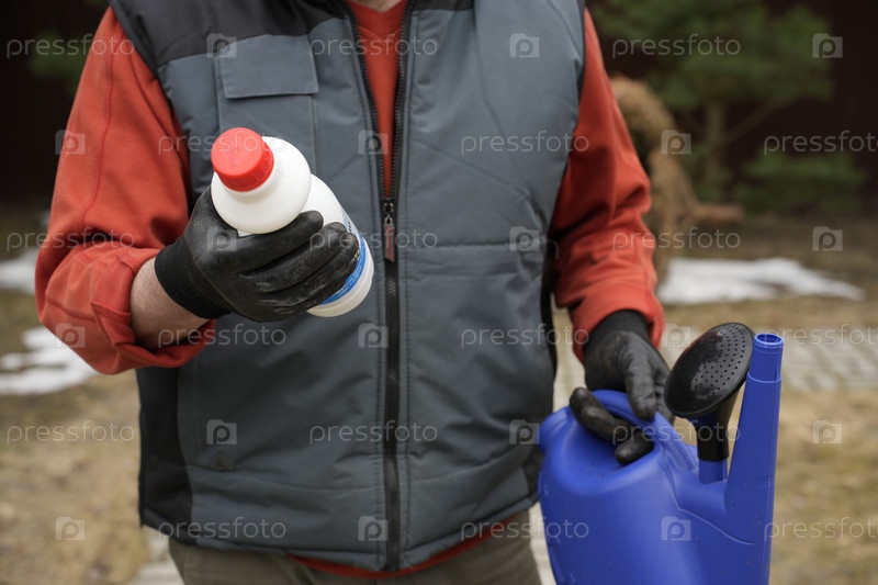 Удобрение почвы ранней весной. Мужчина в перчатках держит лейку и емкость с удобрением