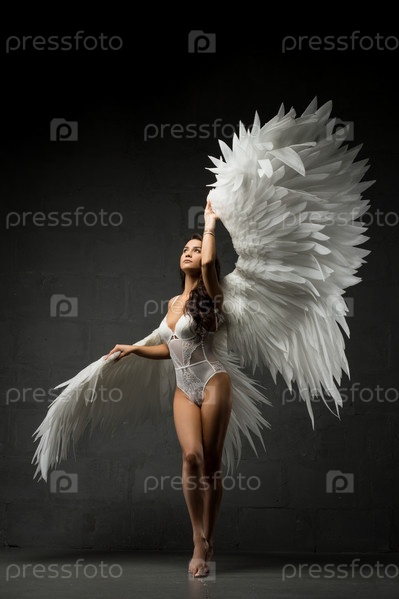 Полное тело изящной босоногой модели в кружевном комбинезоне и крыльях из перьев, стоящей на цыпочках и поднимающей руку