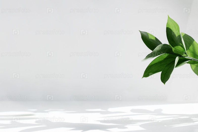 Креативная компоновка красочных листьев риска на белом фоне в лучах солнца, с тенями. Минимальная летняя экзотическая концепция с копией пространства