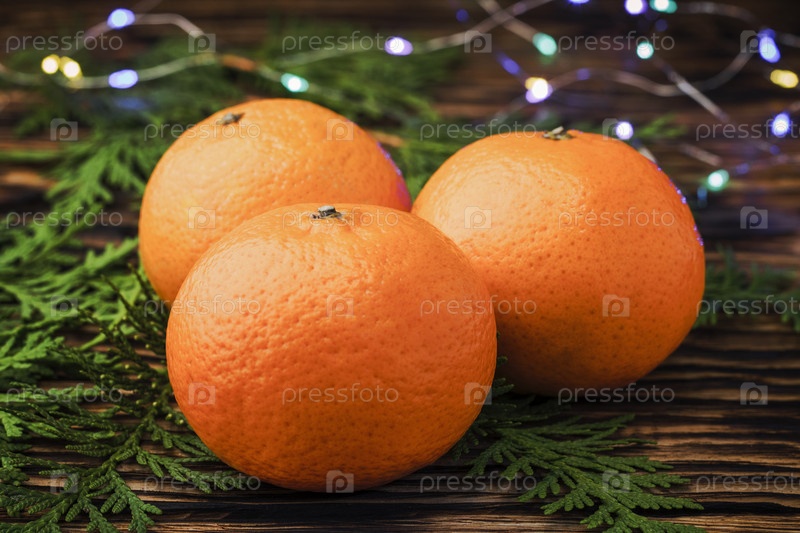 Мандарины на деревянном столе возле хвойных ветвей на фоне гирлянд. Рождественский фон