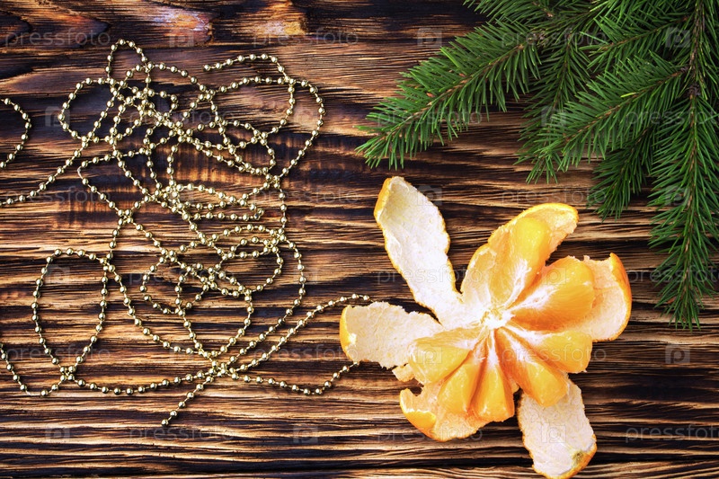Мандарины крупным планом на деревянном столе возле хвойных ветвей ели