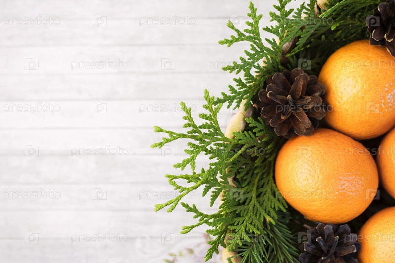 Мандарины в корзине крупным планом на сером деревянном столе возле хвойных ветвей можжевельника и шишек