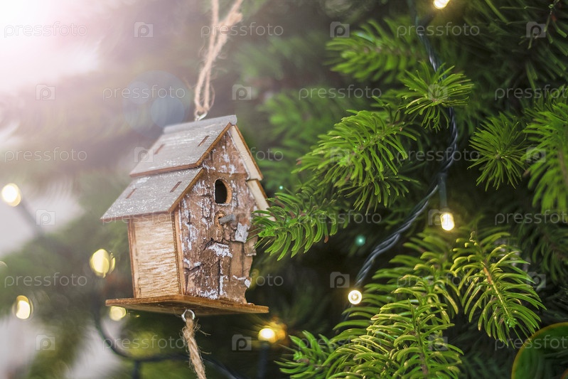 Украшенная рождественская елка с винтажным украшением скворечника. Выборочный фокус. Рождество, новогодняя концепция. Крупный план. Копировать пространство