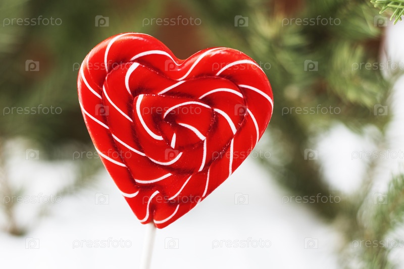 Леденец леденец в виде красно-белого сердца, изолированные на размытом фоне боке. Концепция дня святого Валентина. Копировать пространство