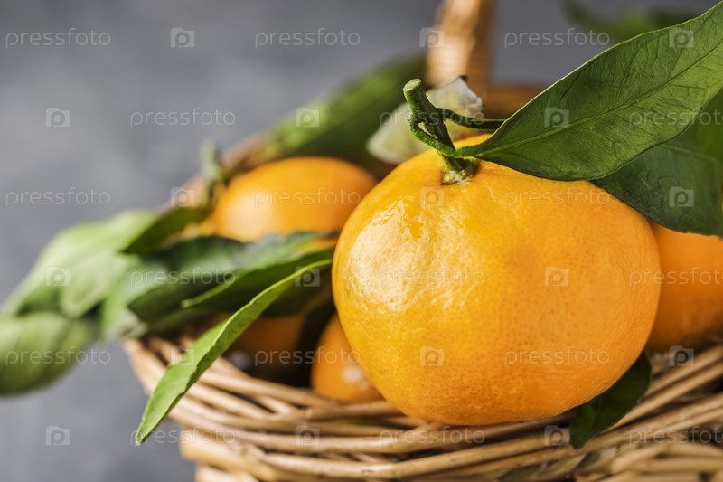Корзина с цитрусовыми рождественскими мандаринами с зелеными листьями на сине-сером фоне. Копировать пространство