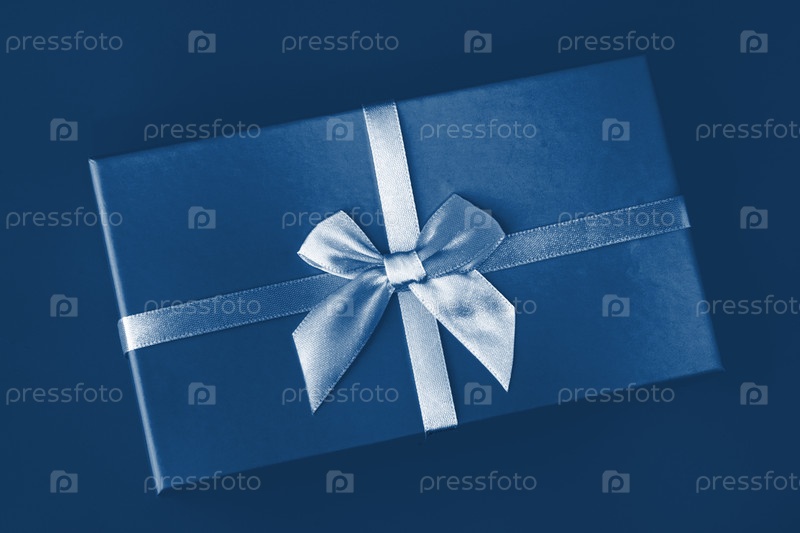 Классический синий цвет 2020 года. Палитра градиентных цветов. Креативная коробка с бантом на классическом синем фоне. Минимальная концепция праздничного подарка. Вид сверху, плоская планировка, крупным планом