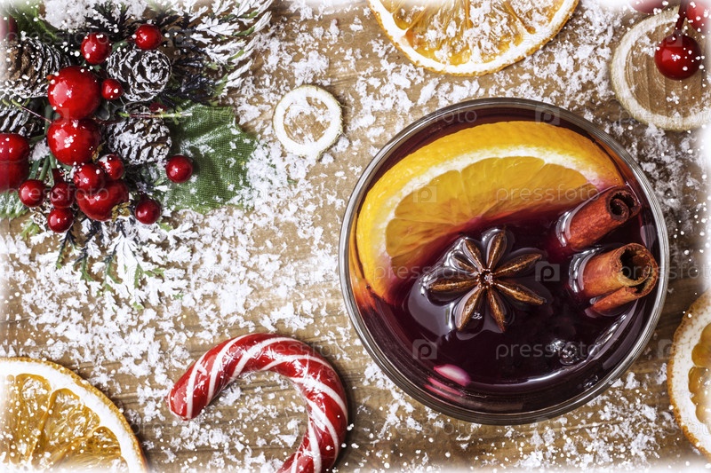 Рождество глинтвейн в бокале, красное вино со специями и фруктами апельсины на деревянном деревенском столе с еловыми ветками новый год. Традиционный горячий рождественский напиток. Рождественский баннер, открытка. Вид сверху. Копировать пространство