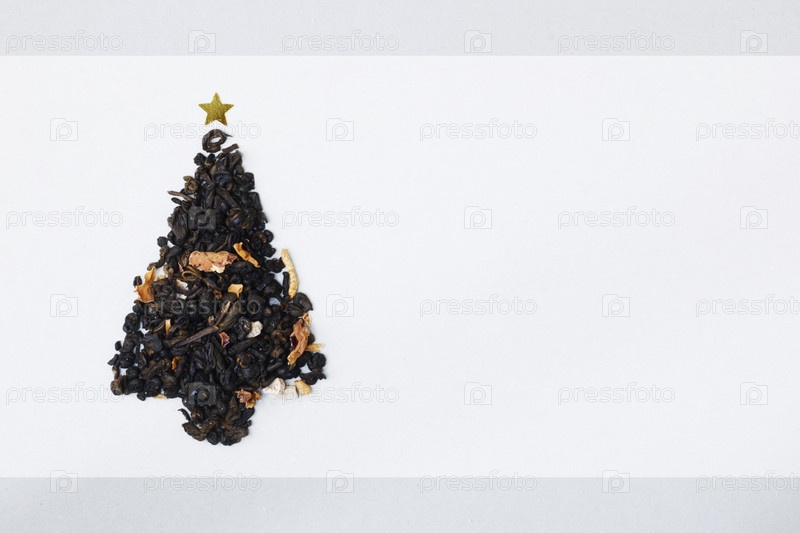 Рождественская елка, сделанная из листьев чая с сухими цветочными и фруктовыми лепестками, изолирована на белом фоне. Концептуальная карта, украшение рождественского новогоднего кафе, ресторана. Креативная новогодняя елка. Копировать пространство