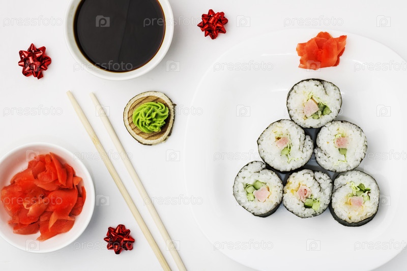 Забавная съедобная рождественская елка из суши-роллов на белом фоне. Креативная идея для японского ресторана. Концепция еды на новый год и рождество. Вид сверху. Скопируйте пространство