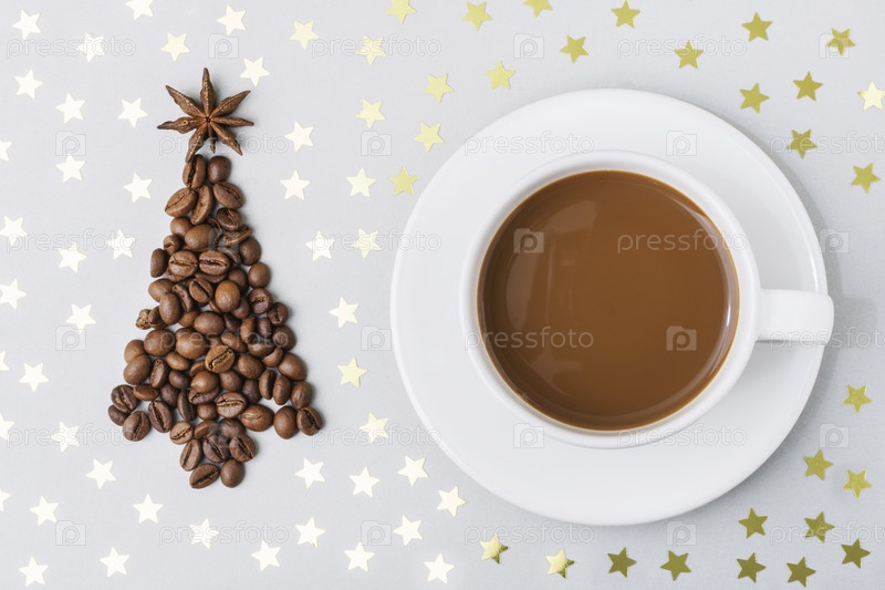 Горячая чашка кофе эспрессо на столе, на сером фоне с золотыми звездами, рядом с рождественской елкой из кофейных зерен. Концепция Рождества и Нового года. Вид сверху. Копировать пространство