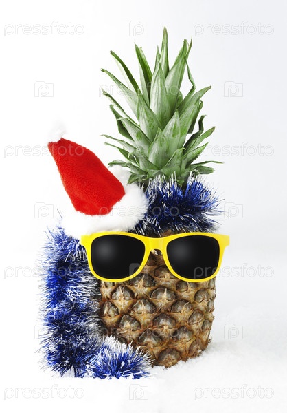 Ананасовый тропический фрукт в костюме шляпы Санта-Клауса и желтых солнцезащитных очках на снегу. Отдельный на белом фоне. Концептуальная открытка на Новый год и Рождество. Копировать пространство