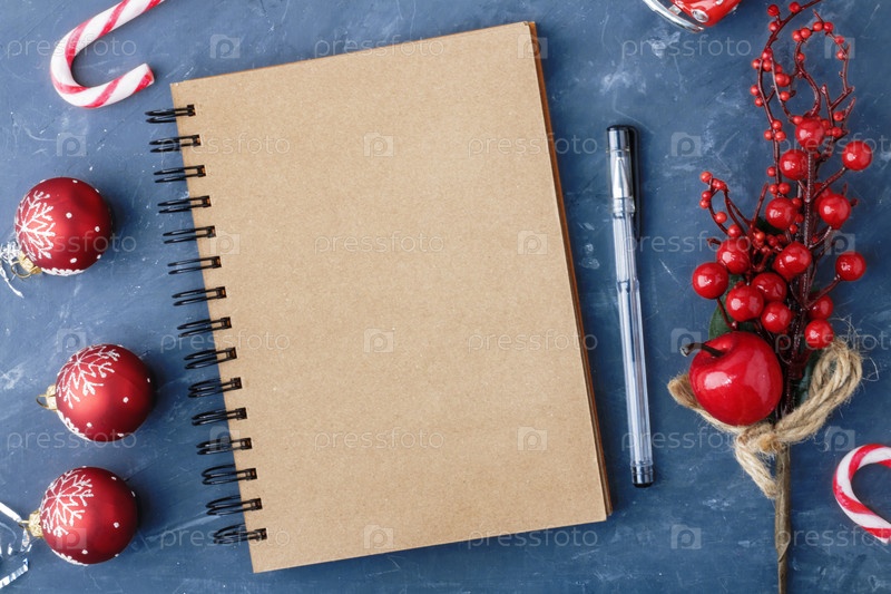 Блокнот для записей. Пустая страница блокнота на синем фоне рядом с елочными ветками и елочным шаром. Рождество, новогодняя концепция. Вид сверху, крупный план. Копировать пространство