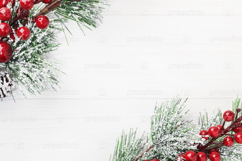 Еловые ветки с рождественским декором на белом деревянном фоне. Рождество, новогодняя концепция. Вид сверху, крупный план. Копировать пространство