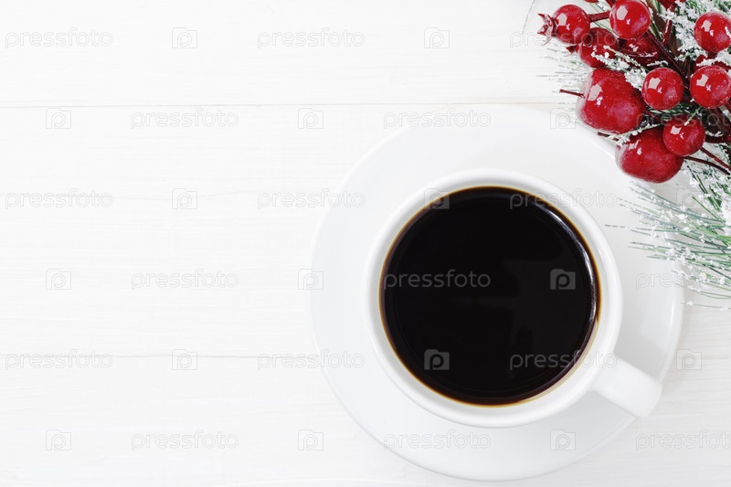 Чашка свежего кофе на белом деревянном фоне рядом с красной снежной рождественской веткой. Рождество, новогодняя концепция. Вид сверху, крупный план. Копировать пространство