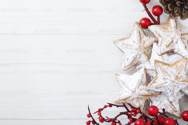 Печенье в форме звезды, на белом деревянном фоне, рядом с рождественскими ветвями и шишками. Рождественский и новогодний десерт. Песочное. Имбирное печенье. Домашняя выпечка. Копировать пространство
