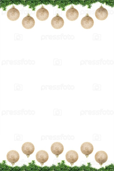 Рождественская граница их хвойных еловых веток с висящими золотыми шарами на белом фоне. Фон рамки баннера концепции на Рождество и Новый год. Копировать пространство