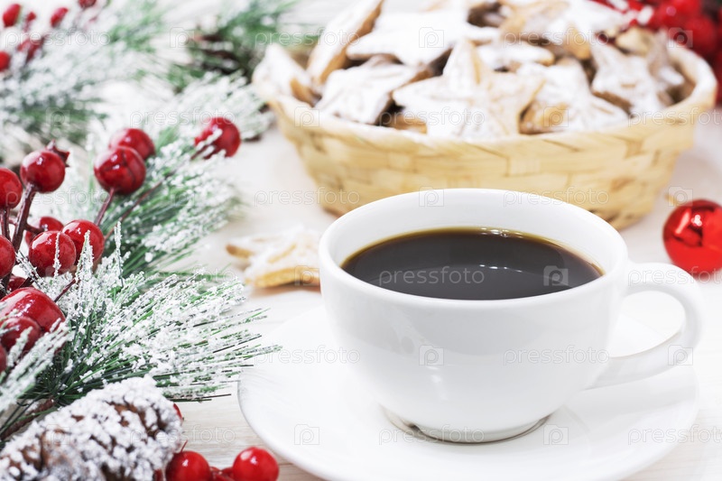 Белая кружка черного кофе американо на белом деревянном фоне рядом с рождественской веткой и печеньем, а также новогодними игрушками. Рождество, новогодняя концепция