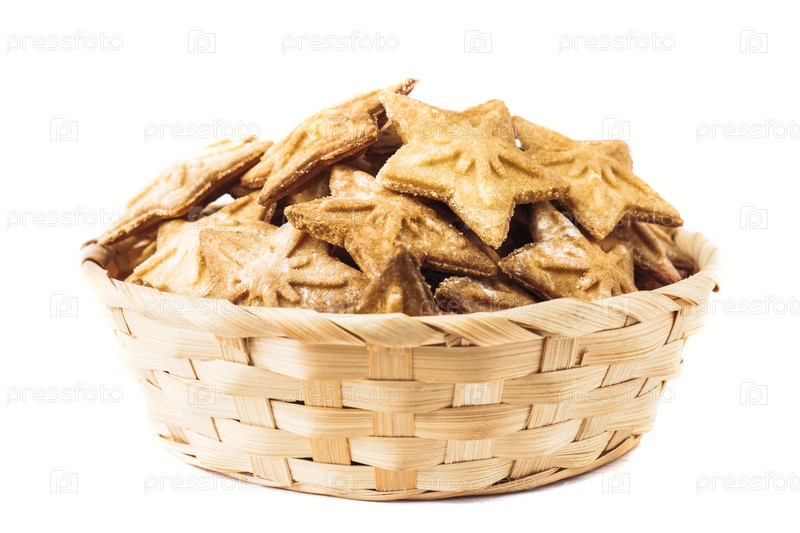 Печенье в форме звезды в плетеной натуральной корзине, изолированное на белом фоне. Песочное. Имбирное печенье. Домашняя выпечка