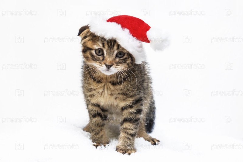 Маленький котенок сидит в шапке Санта-Клауса на снегу. Концепция Рождества и Нового года. Рождественские животные. Копировать пространство
