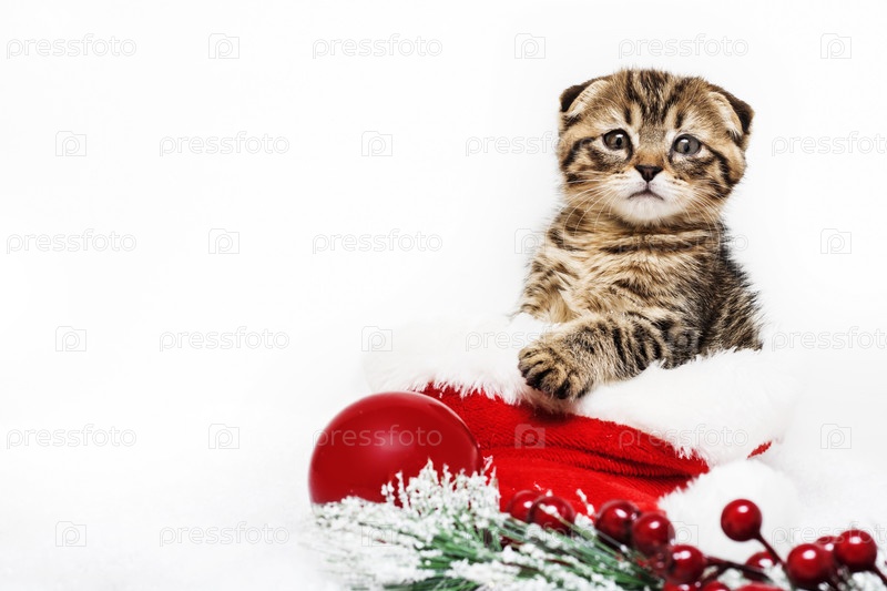 Маленький котенок в шапке Санта-Клауса сидит на снегу рядом с рождественской веткой и красным шаром. Концепция Рождества и Нового года. Рождественские животные. Копировать пространство