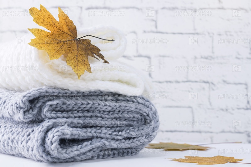 Теплые вязаные свитера и опавшие осенние кленовые листья. осенняя концепция. Скопируйте пространство. Женская одежда