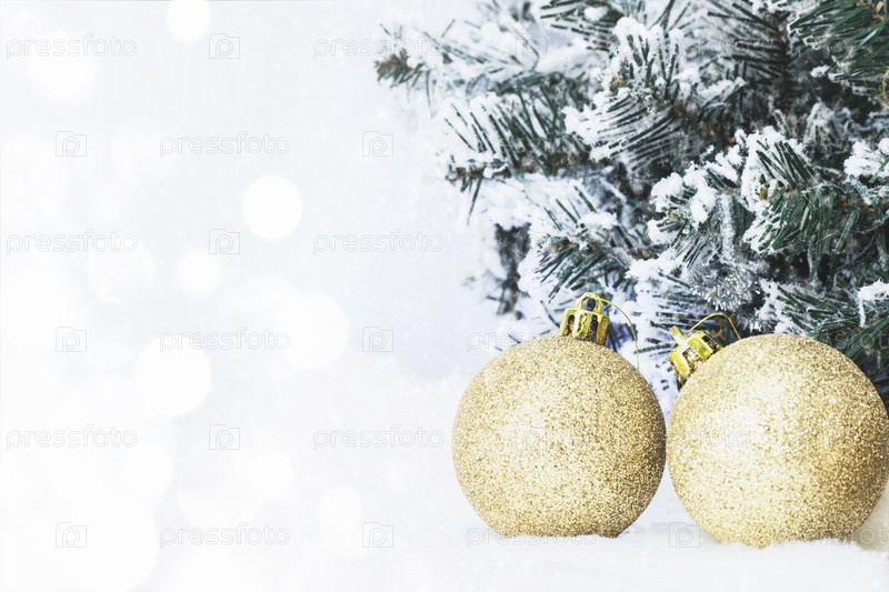 Поздравительная открытка с новым годом и рождеством с копией пространства для текста. Абстрактный фон Рождество. Рождественские шары и еловая ветка на абстрактном фоне. Боке и снег