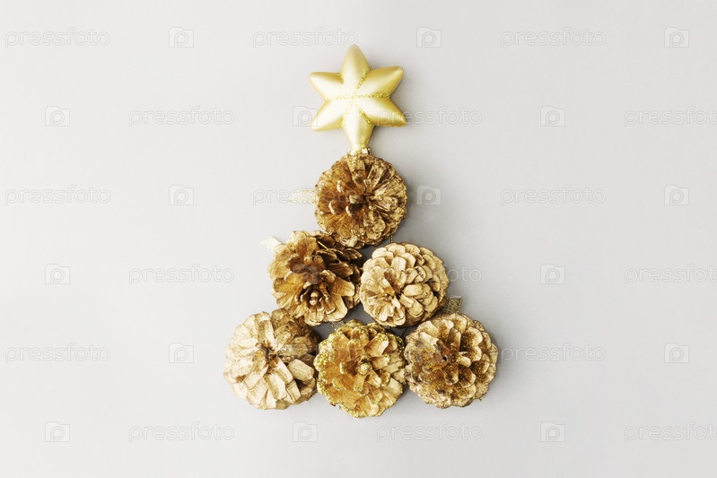 Макет елки из еловых шишек и золотой звезды на сером фоне. Рождественская композиция. Креативная концепция. Концепция празднования Рождества, счастливого Рождества и зимних праздников