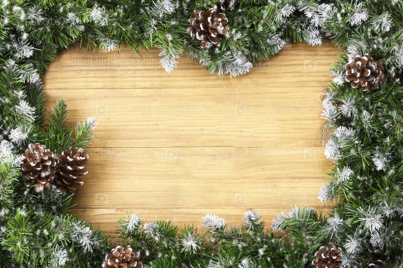 Рождественская граница в форме арки, состоящая из заснеженных еловых веток и шишек на рождественском деревянном фоне. Фон зимнего отдыха. Отлично подходит для новогодних открыток, баннеров, заголовков, партийных плакатов