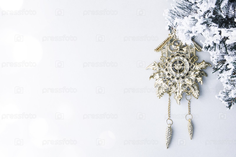 Часы в стиле ретро на украшенной снежной ели. Поздравительная открытка с новым годом и рождеством с копией пространства для текста. Абстрактный фон Рождество