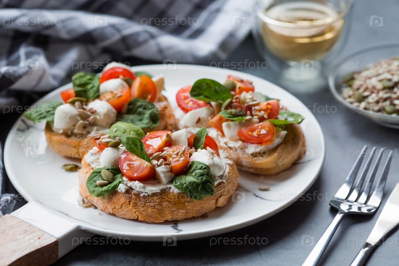 Брускетта (бутерброды) с помидорами черри, сыром моцарелла и зеленью на стильной тарелке на темном фоне. Традиционная итальянская закуска