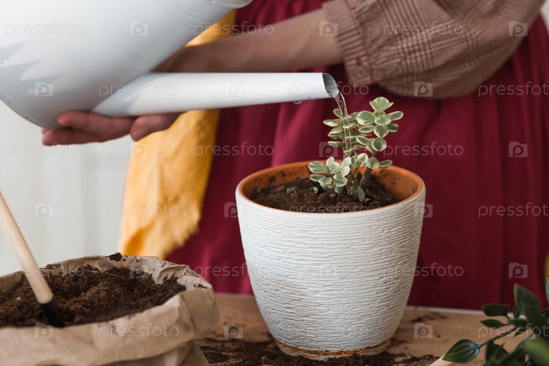 Молодая женщина в винтажной одежде в интерьере кухни бережно ухаживает, пересаживает и поливает комнатные растения. Руки девушки и растения крупным планом. Сад