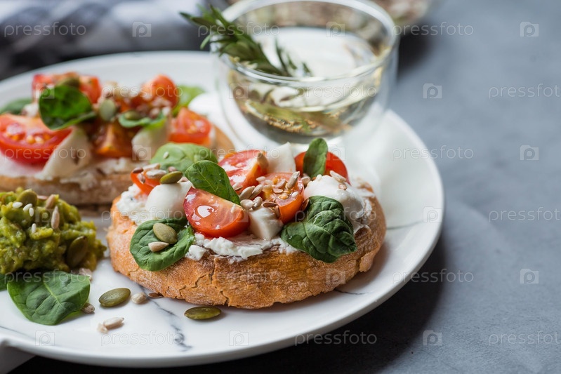 Брускетта (бутерброды) с помидорами черри, сыром моцарелла и зеленью на стильной тарелке на темном фоне. Традиционная итальянская закуска