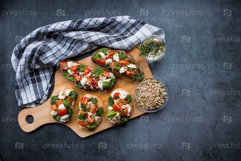 Брускетта (бутерброды) с помидорами черри, сыром моцарелла и зеленью на разделочной доске на темном фоне. Традиционная итальянская закуска