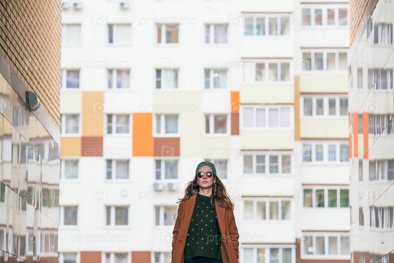 Портрет молодой хипстерской женщины 30+ в солнечных очках и стильной одежде в городе на фоне кирпичной стены. Современный образ жизни