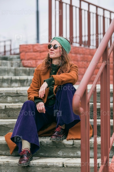 Портрет молодой хипстерской женщины 30+ в солнечных очках и стильной одежде в городе на фоне кирпичной стены. Современный образ жизни