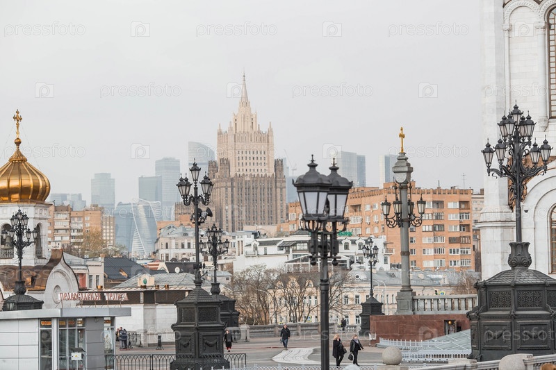 Русский православный собор - часовня храма Христа Спасителя в Москве на фоне Министерства иностранных дел России и города Москвы. Российская Федерация, Москва