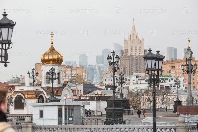 Русский православный собор - часовня храма Христа Спасителя в Москве на фоне Министерства иностранных дел России и города Москвы. Российская Федерация, Москва