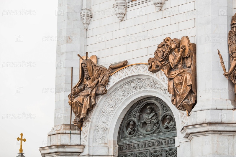 Русский православный собор — это собор Христа Спасителя в Москве в весенний день. Детали храма крупным планом. Российская Федерация, Москва