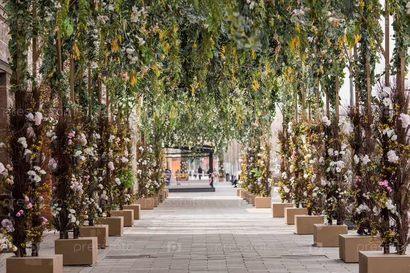 Пасхальные украшения города. Арки с весенними цветами на набережной. Россия. Москва