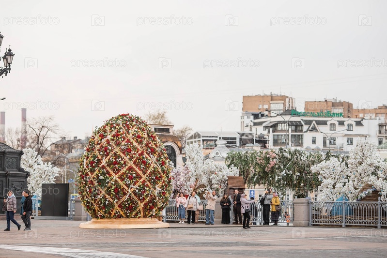 Пасхальная неделя в городе. Фестиваль "Пасхальный дар" Пасхальная инсталляция у Храма Христа Спасителя. Пасхальный декор на улицах города. Московские сезоны. Россия. Москва
