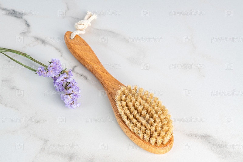 Щетка для сухого массажа с натуральной щетиной на мраморном фоне, экокосметика, спа-процедуры по домашнему уходу
