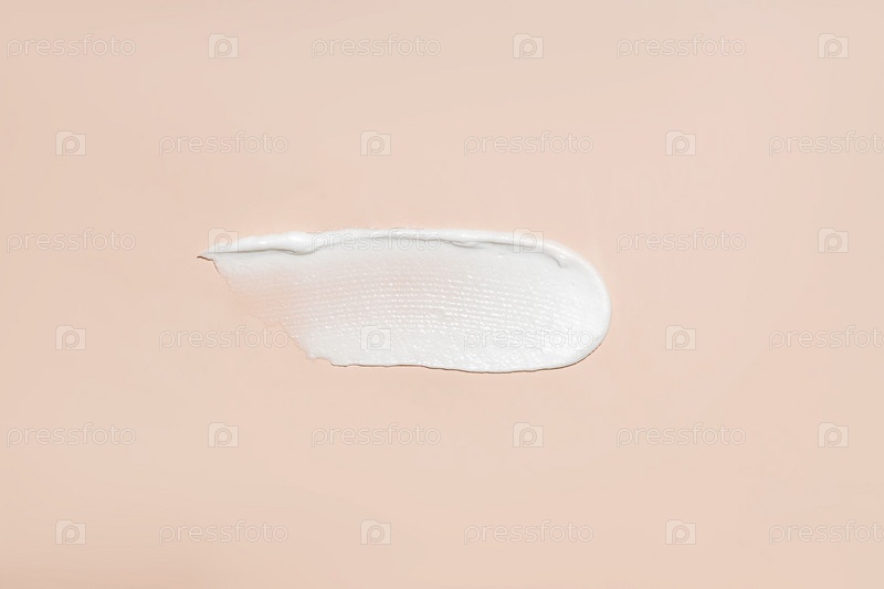 Косметический продукт смазывает белый увлажняющий крем-лосьон на бежевом, выдавливает и размазывает часть тестирования крема для ухода за кожей