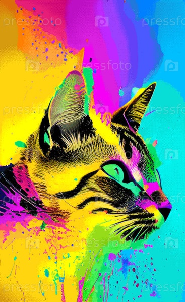 Картина разноцветными кляксами с цветами профиля кота