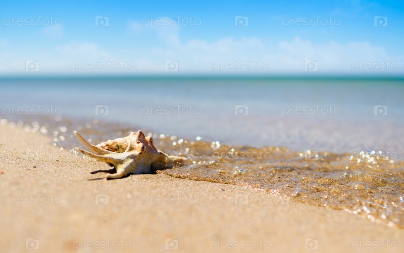 Красивая раковина в морской волне. Летний морской пейзаж. Избирательный фокус на ракушке, узкий фокус