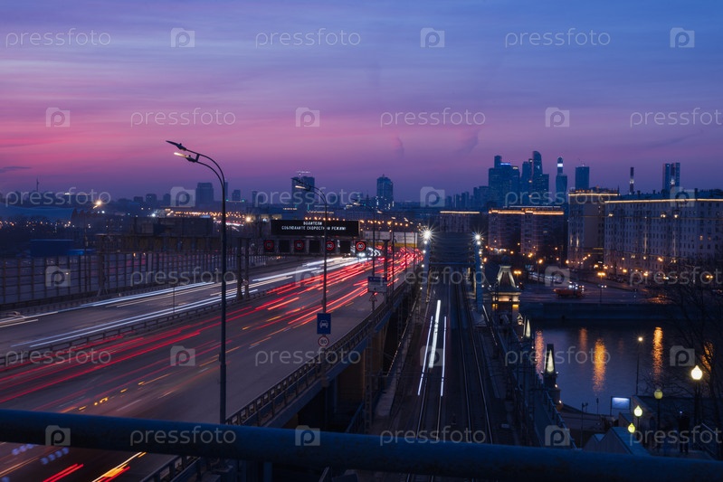 Ночной вид на Москву-реку и автомобильно-железнодорожный мост