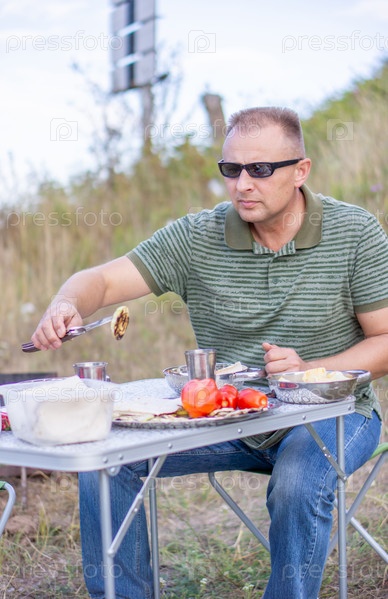 Мужчина на пикнике в летний день ест запеченные овощи. Концепция летнего питания на открытом воздухе