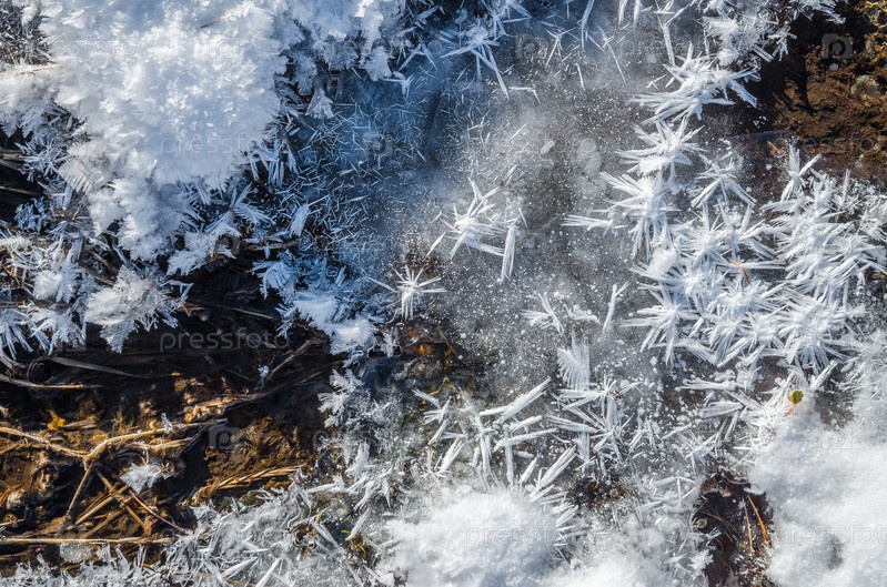 Крупный иней на льду ручья