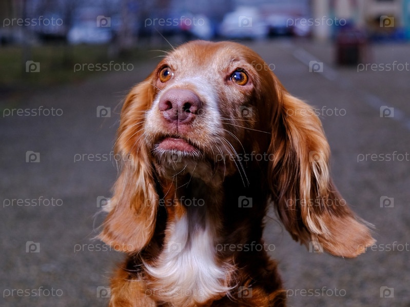 Собака породы русский спаниель рыже - белого окраса крупным планом