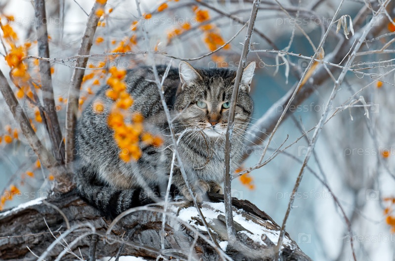 Кошка сидит на ветке облепихи в морозный зимний день. Неглубокий фокус