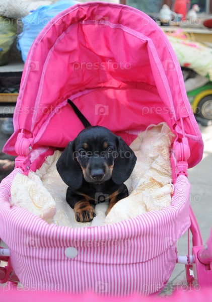 Щенок-такси в игрушечной коляске .Dachshund puppy in a toy stroller